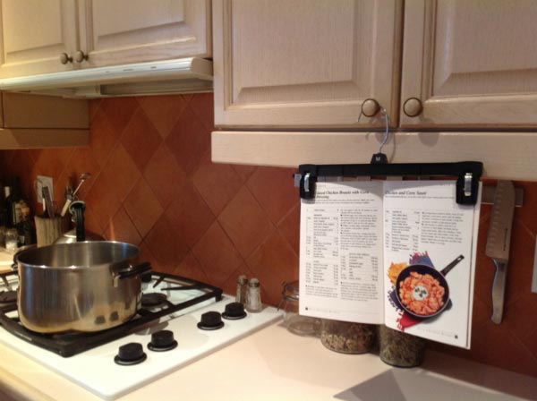 1. Как открыть поварскую книгу, чтобы она не закрылась. Многие женщины по старинке готовят новые блюда с раскрытой книгой под рукой. Но, вот незадача, книга часто закрывается, когда руки уже в муке или, что еще хуже, в масле. Тогда приходится мыть руки и снова искать нужную страницу. Для того чтобы избежать данной ситуации, можно достать их шкафа детскую вешалку, повесить ее на ручку кухонного шкафа и с помощью обычных прищепок прикрепить к ней открытую на нужной странице книгу.