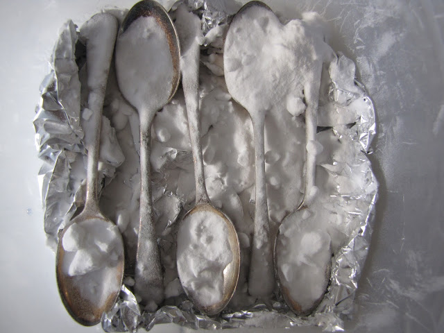– Содовый раствор. Дно стеклянной кастрюли устилают пищевой фольгой и сверху выкладывают столовые серебряные приборы, засыпав их содой, сверху накрывают еще одним слоем фольги. После этого заливают кипятком и оставляют на четверть часа. От такой процедуры налет отстает от серебра и его промывают под проточной водой.