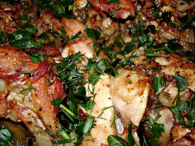 – На удобной разделочной доске хорошим универсальным ножом отделяют заднюю часть тушки от передней немного выше лапок. Грудку разрезают на четыре части, лапки разрезают на две половинки по суставам, срезают мякоть с живота. Далее удаляют внутренности. Когда тушка остается без внутренностей, ее разрезают вдоль позвоночника и каждую часть делят на кусочки.