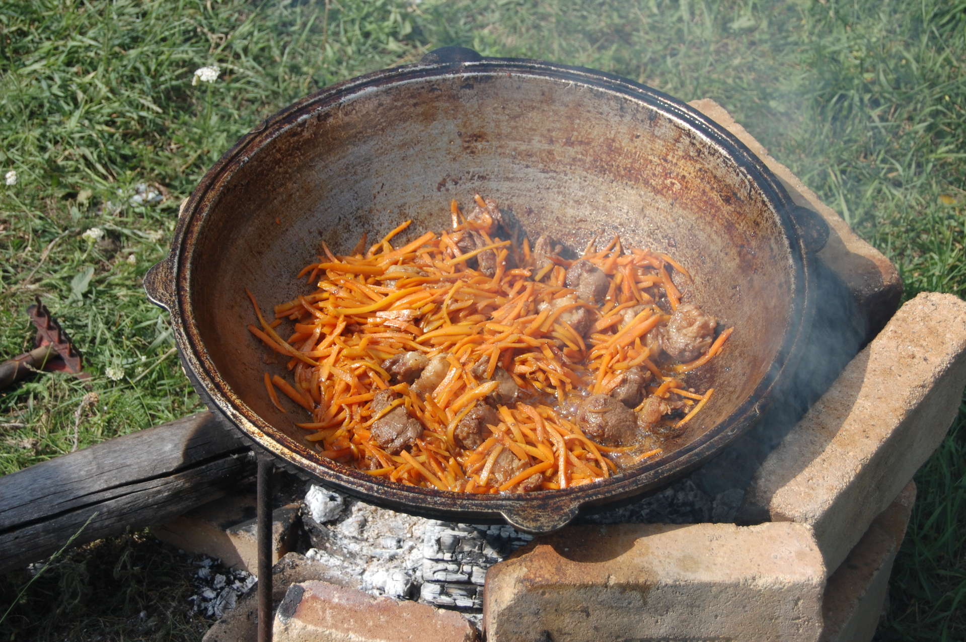Готовка еды в чугунной посуде на костре