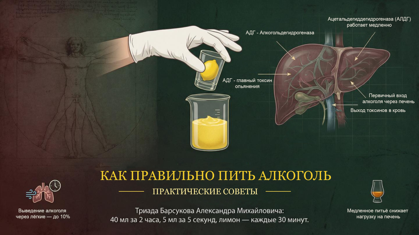 Доктор Барсуков объясняет, как правильно пить алкоголь: маленькие глотки, лимон для снижения токсичности и контроль...